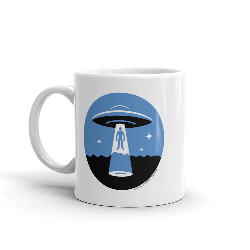 Alien abduction minimalist UFO design on a sturdy and glossy coffee mug.