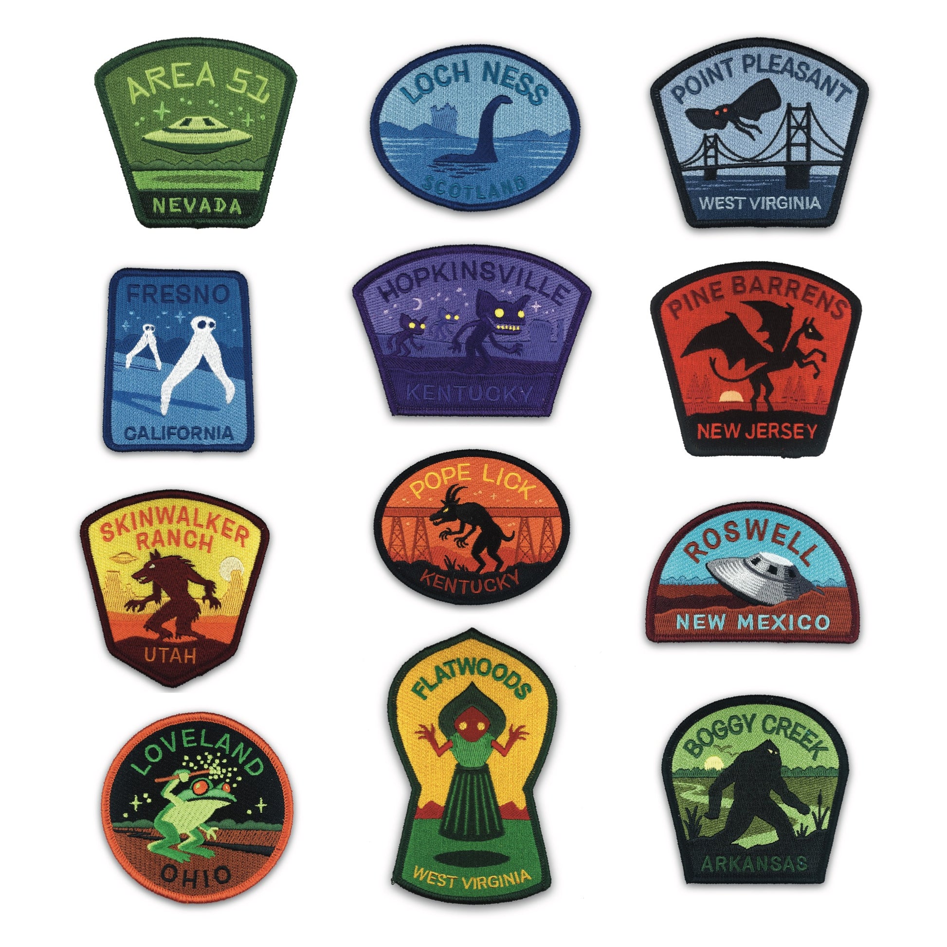All 12 travel patches from the Paranormal Places Series 1 set. Choice of iron-on or hook-and-loop patch backing.